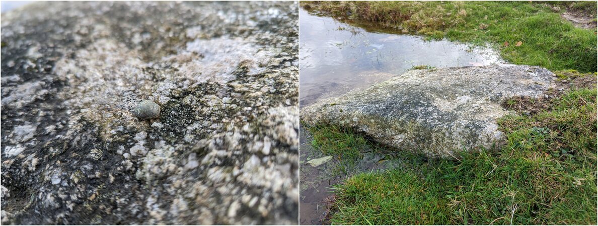 This bolt and cut mark reside on a flat-topped boulder opposite Pork Hill Car Park. The bolt is easy to spot but the cut mark is difficult to discern because it is quite faint – so much so that I didn’t notice it the first time I visited. After rain this area can be like a stream. (MP comment, October 2022)