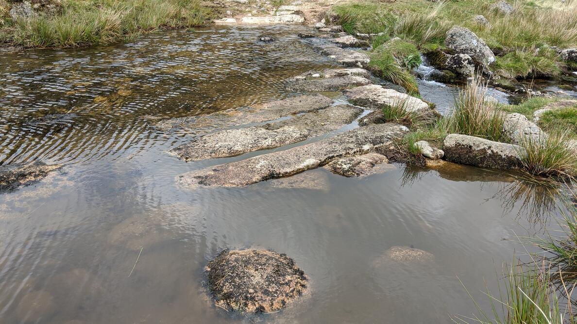 There is a submerged clapper bridge at Knack Mine Ford. Hemery (1983) writes: “The track crossing the river at Knack Mine Ford is an old peat road between Belstone and Hangingstone Hill, later utilized by the miners, who built the clapper bridge described by Crossing in 1908 as “partly ruined”. Its ruin has long been complete and the impost slabs now lie piled by the force of the river at its edge. Its dimensions when intact were recorded by Dr Arthur B. Prowse in 1889 as twenty-nine feet long, fifteen feet wide, of four openings and spanning the river obliquely – parallel to the paved ford, in fact.“
